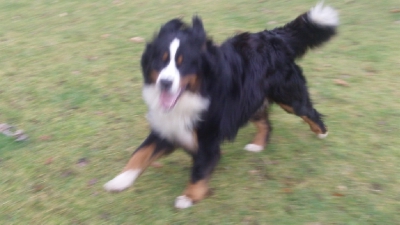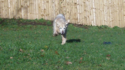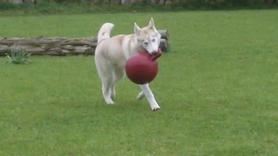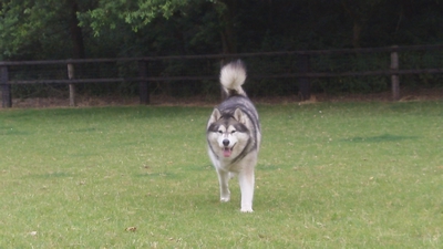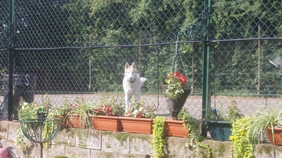 Husky Rex in playpen/tennis court.